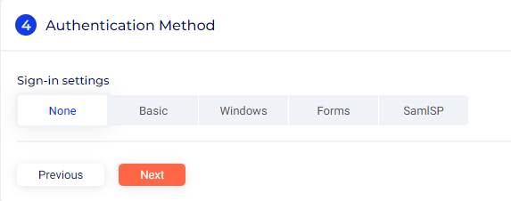 None -- Selecting this option means the user will be prompted for authentication before signing in to the application. If the application or resource requires authentication, it must be entered manually. This option is available on all applications.