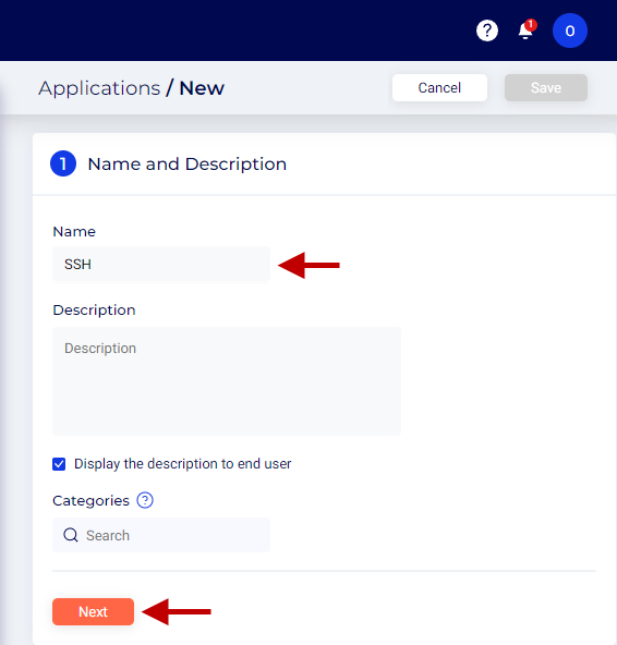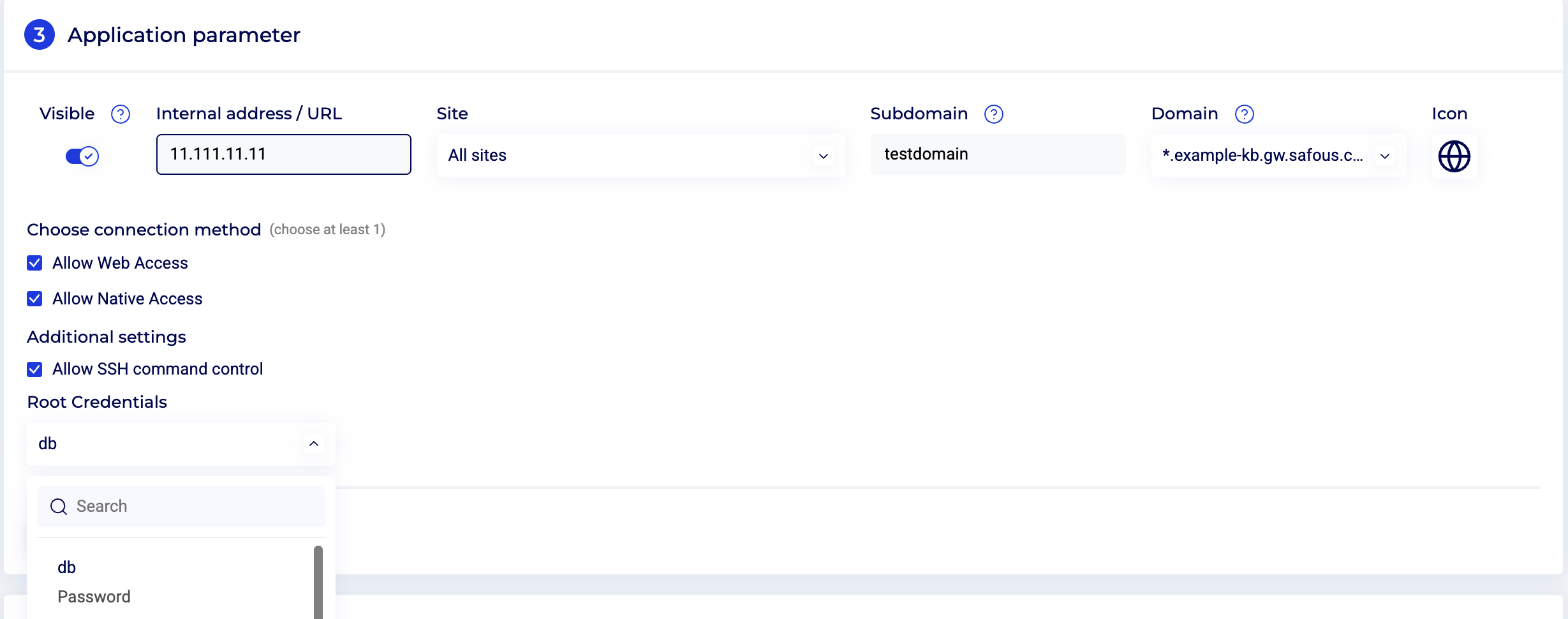 Domain - Domains added under Applications > Domains page are listed here. By default, the tenant domain is displayed in this field. Click the drop-down to select the domain of your choice. For this article, we select the domain *.domain.gw.safous.com. The published URL will be ssh.domain.gw.safous.com.