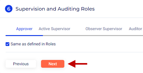 - For the purpose of this article, we retain the default settings for each role. Keep the option Same as defined in Roles enabled. For more information on Supervision and Auditing, refer to the section: Supervision and Auditing Roles.