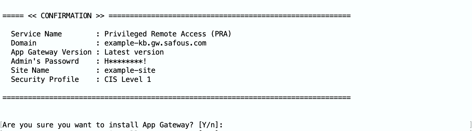 - The installer will display your choices and ask for the final confirmation before proceeding for the installation of the App Gateway.