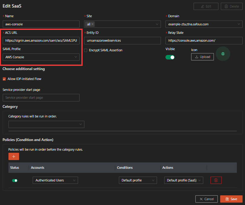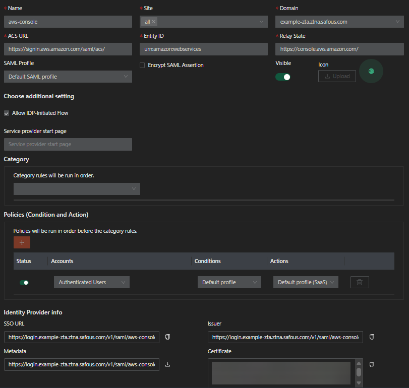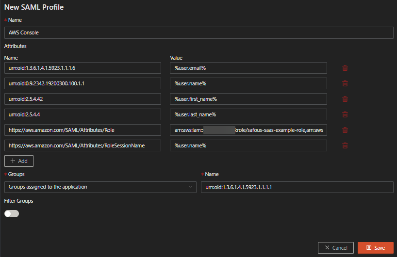 This article will guide you on how to configure user access to AWS Management console via Safous AppGW by assuming IAM role. Safous will act as the Identity Provider (IdP) while AWS acts as the Service Provider (SP).