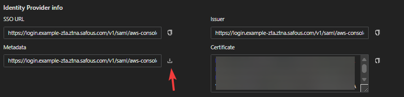 Value: A pair of the copied IAM role ARN and Identity Provider ARN separated with comma (e.g. arn:aws:iam::xyz:role/safous-saas-example-role,arn:aws:iam::xyz:saml-provider/Safous)