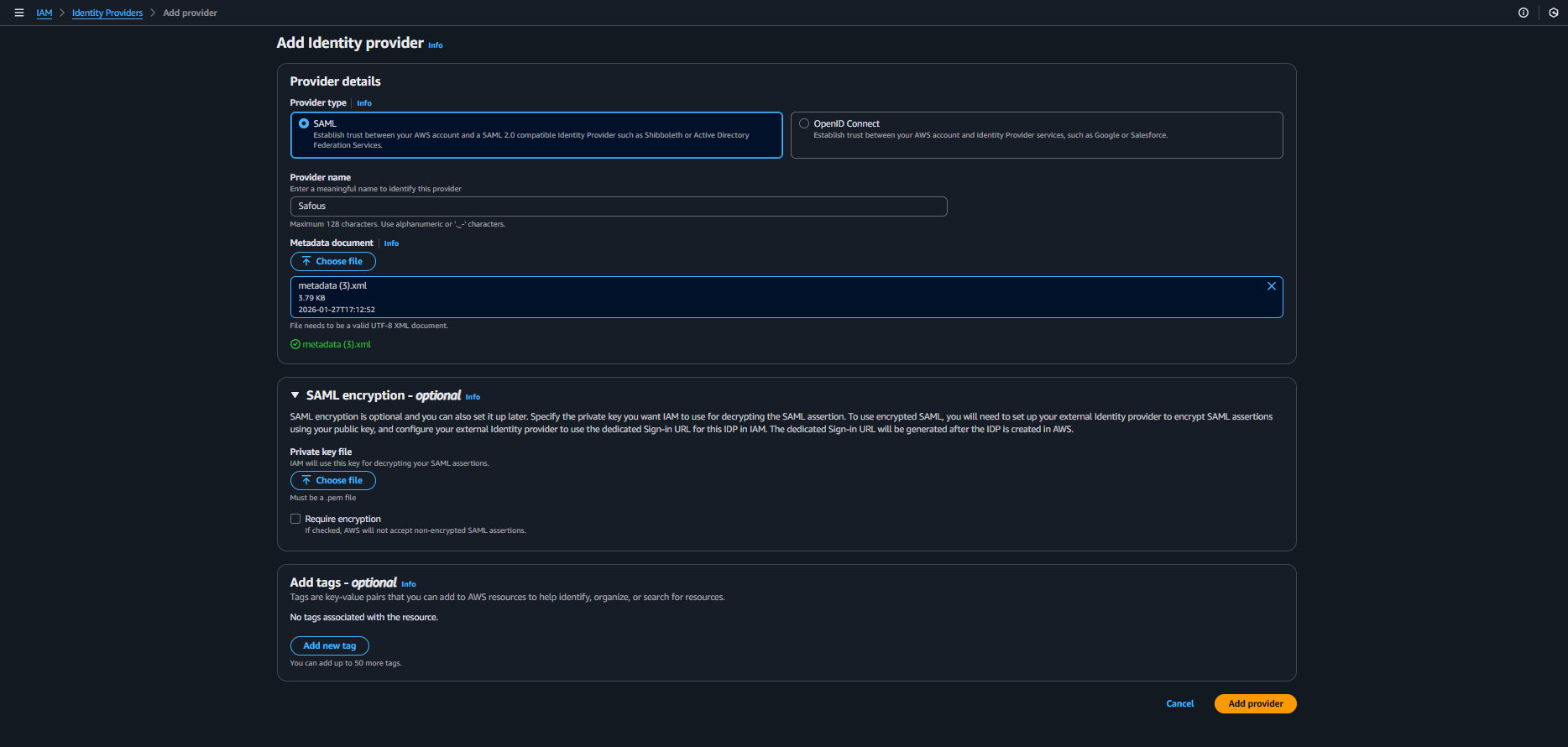 Click Add new tag button should you want to assign tags to the Identity provider.