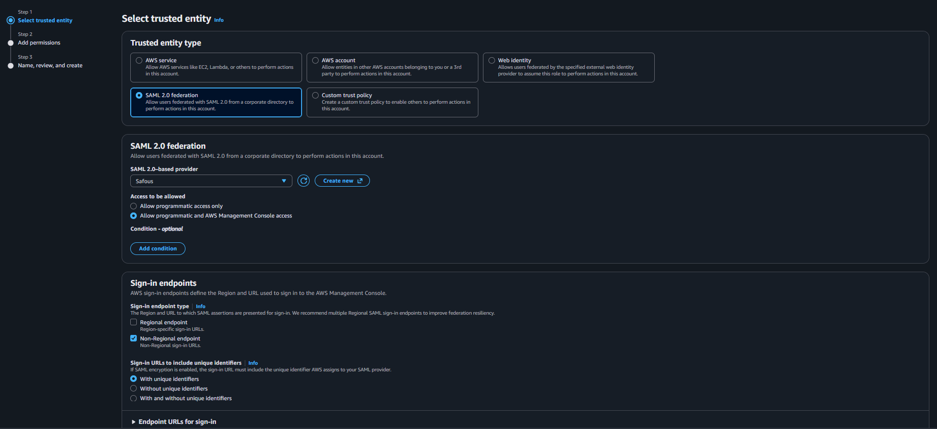 Trusted entity type: Select SAML 2.0 federation