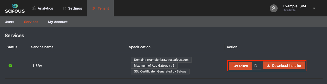 Login to Safous Admin Portal and navigate to Tenant > Services where you can find the Get Token and Download Installer button.