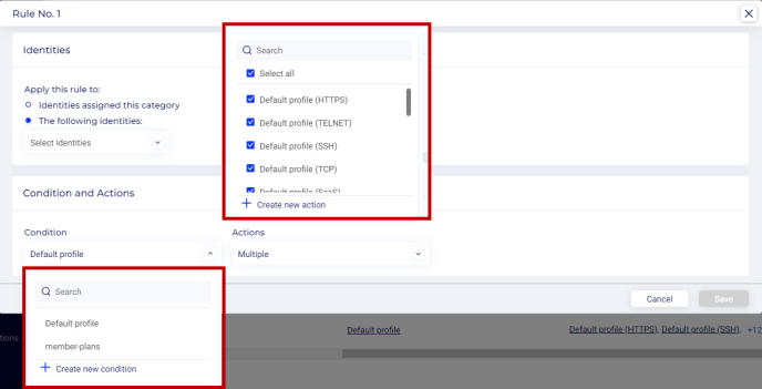 - Click the drop-down under Actions to change the default profiles selected. Custom profiles, if created on the Actions page, are listed here. Click the Create new action to create a new Action profile.