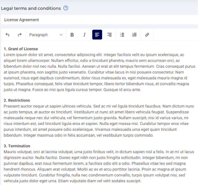 Enter the terms and conditions for using your service or product. The option Accept legal documentation in the identity providers settings on the Integrations > Identity Providers page must be enabled for this option to work.