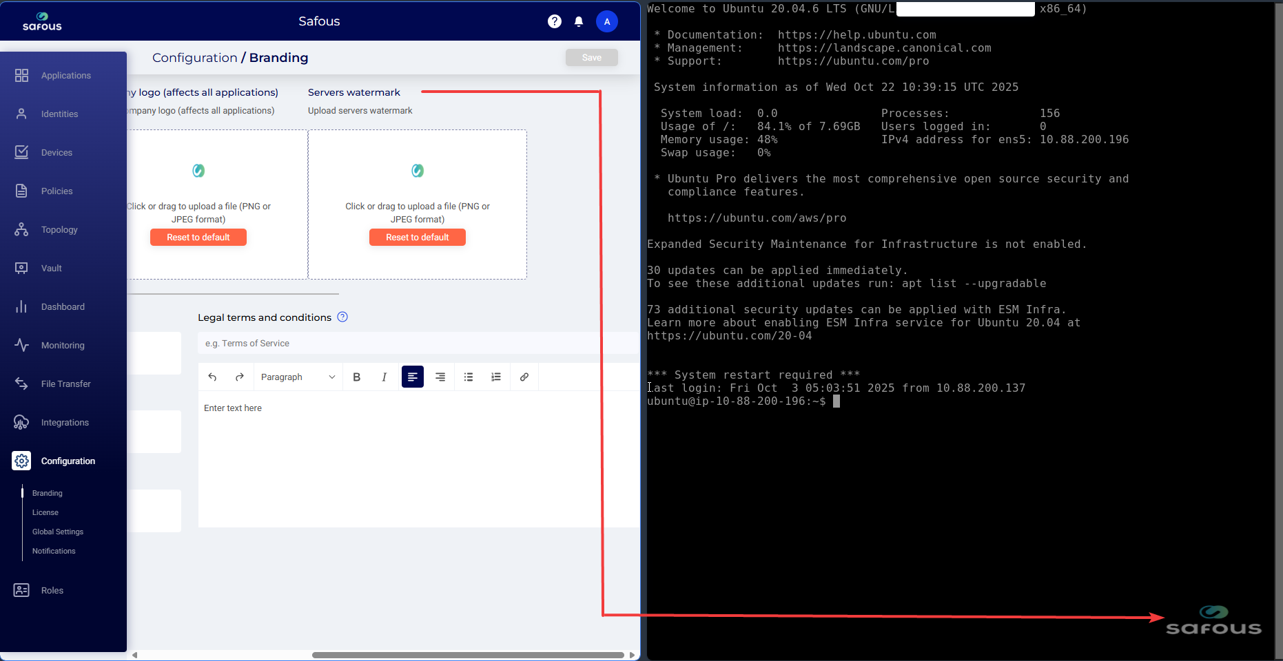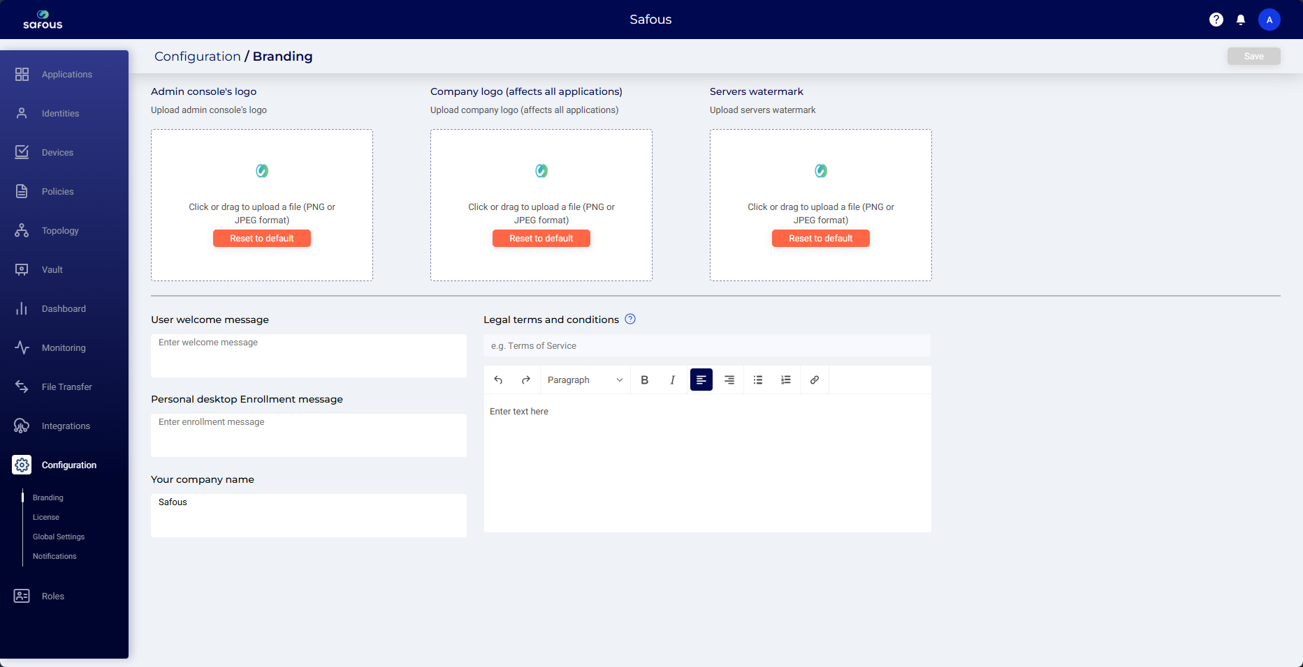 The Branding page under the Configuration menu on the Safous admin portal has various options to display your company logo or brand name, in addition to a word processor to upload a license agreement or similar legal document and format the same. This article describes each option on the page.