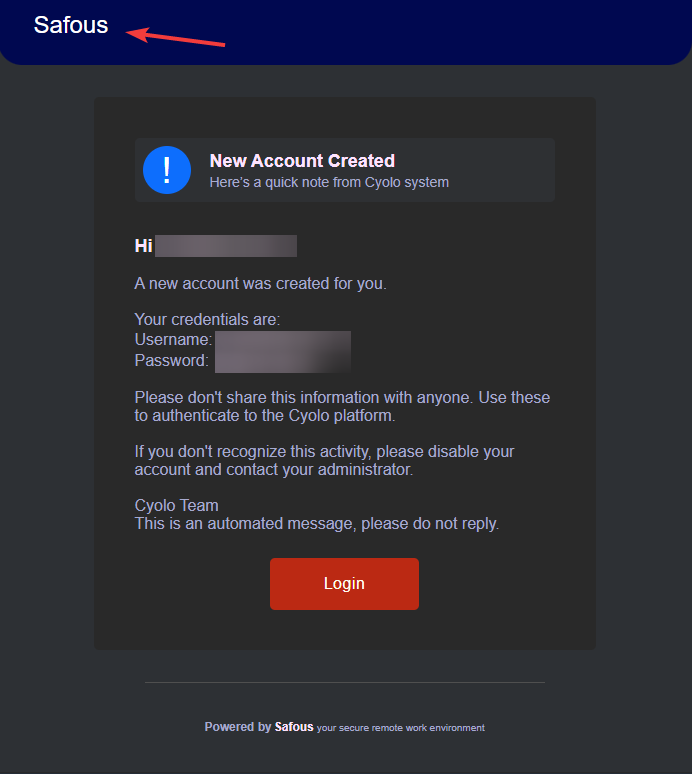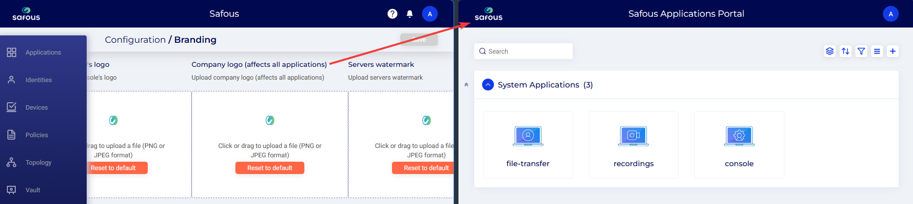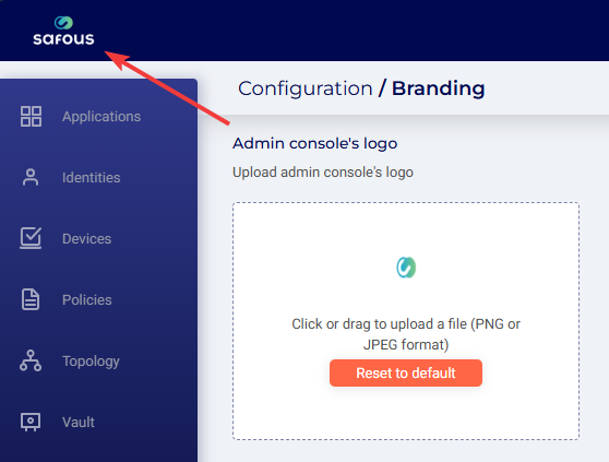 Click inside the box to upload your corporate logo to be displayed on the Safous Applications Portal. You can also drag and drop the image file. File types supported: PNG, JPEG.