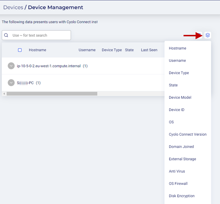 The Device Management page displays information about devices that have the Safous Agent installed. The information is acquired using Osquery. Administrators can choose to select or deselect which information is displayed on the page. This includes devices that are currently connected and those that connected in the past.