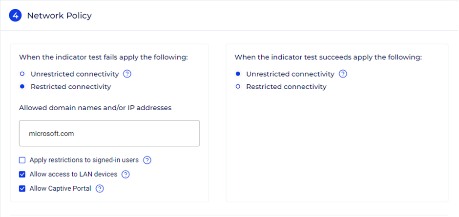 If network indicators are configured, administrators can choose to apply the network policy based on whether the network indicator test fails or succeeds.