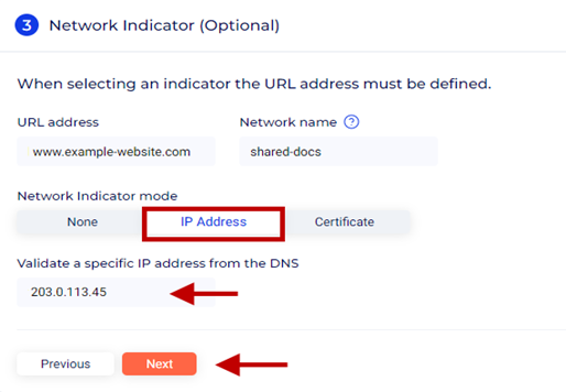 Validate a specific IP address from the DNS β Enter the expected IP address the URL entered above resolves to. The agent will perform name resolution of the URL entered above on the deviceβs network and will verify whether the resolved IP address matches the configured IP address here. If it matches, the indicator test is successful; if it does not, the test has failed.