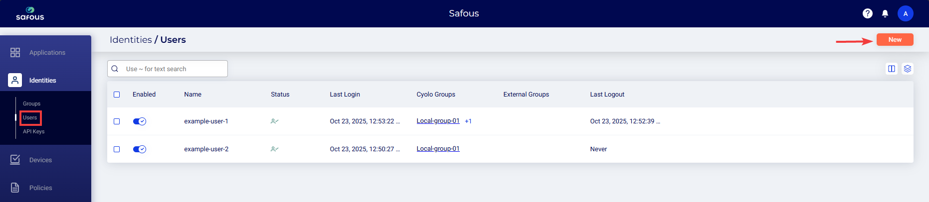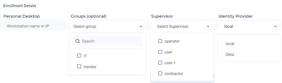 Supervisor -- Select a user from the drop-down menu to choose the supervisor to approve the user's login to the Safous Application Portal. This is an optional field. Note: Selecting a supervisor here replaces the MFA option configured on the Configuration > Global Settings page. For detailed information on supervision, refer to the section: Supervision and Auditing Roles.