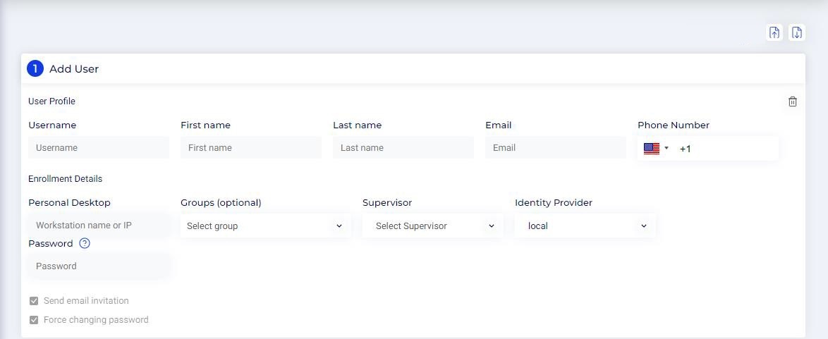 Force changing password -- This option forces the user to set a new password when logging in to the Application Portal for the first time. The option is enabled by default and can be disabled. This option is available only if local is selected in the Identity Provider field.