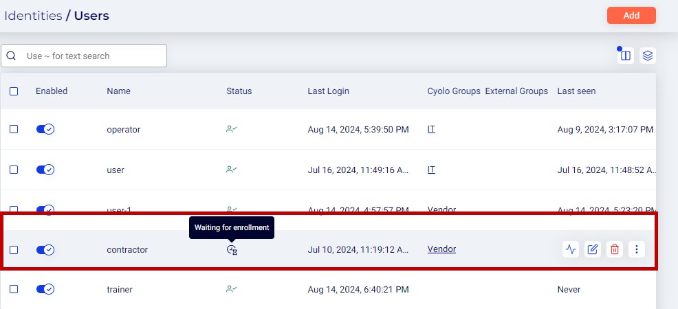 The status of a newly added user on the Users page when supervisor approval is set is Waiting for Enrollment.