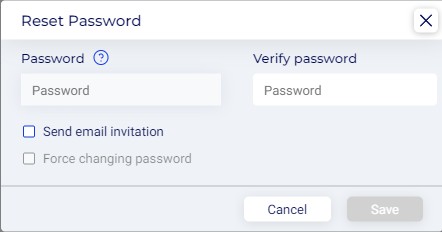 a. Reset Password - Clicking this option will open the Reset Password window. Enter a new password and verify it by re-entering. Optionally, enable the checkboxes alongside Send email invitation and Force changing password.