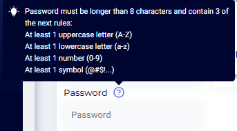 Password - Enter the password for the user. The password must meet the constraints set in the password policy selected on the Integrations > Identity Providers > local page. The tooltip that appears when the admin clicks on this field displays the minimum password requirements as defined in the policy. For more information on password policy, refer to the section: How to Create a Password Policy