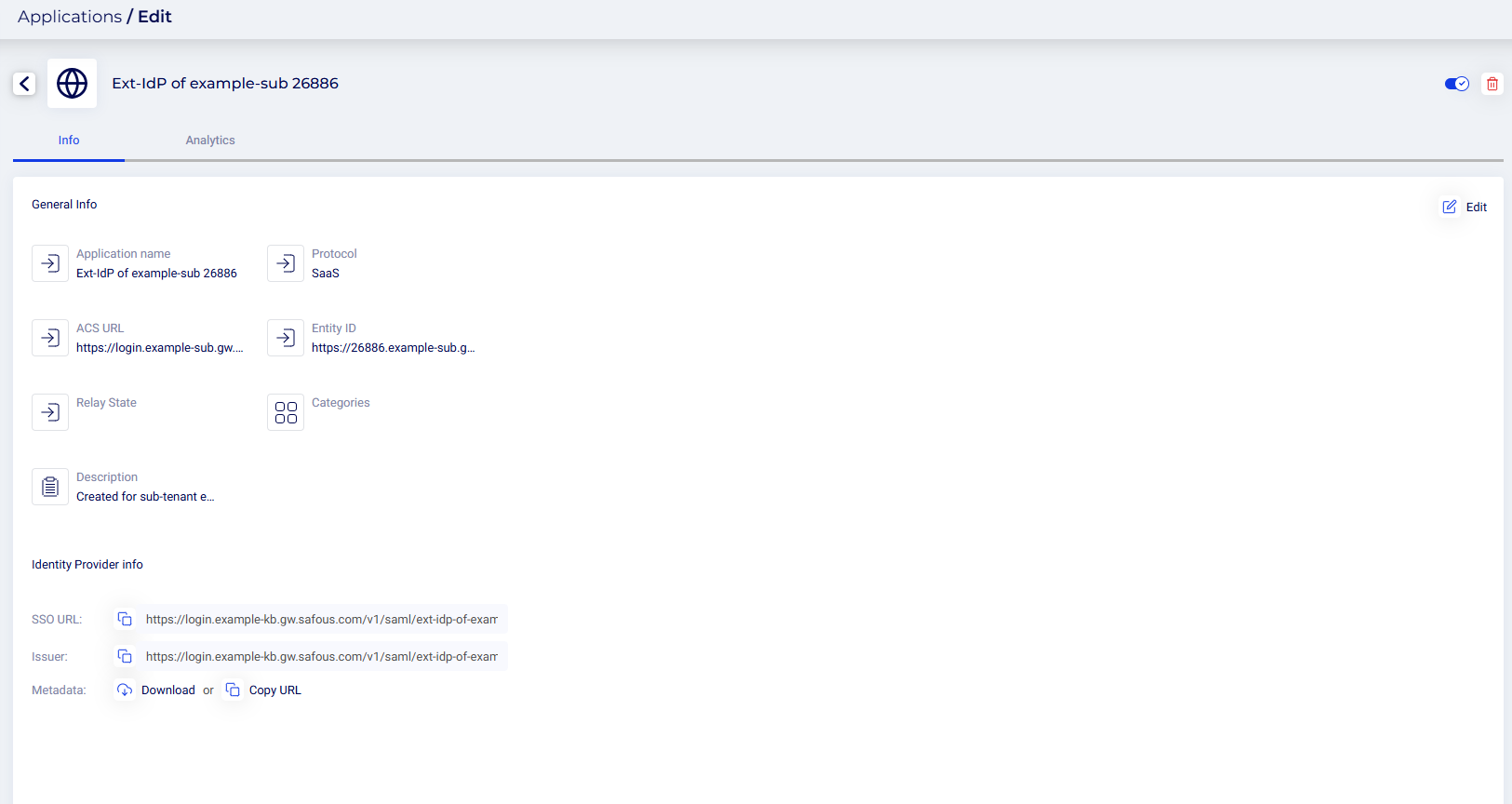- SaaS Application: The name format is "Ext IdP of [sub-tenant domain name] [6-digit random number]".