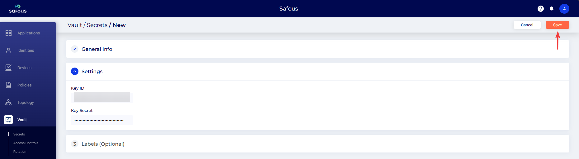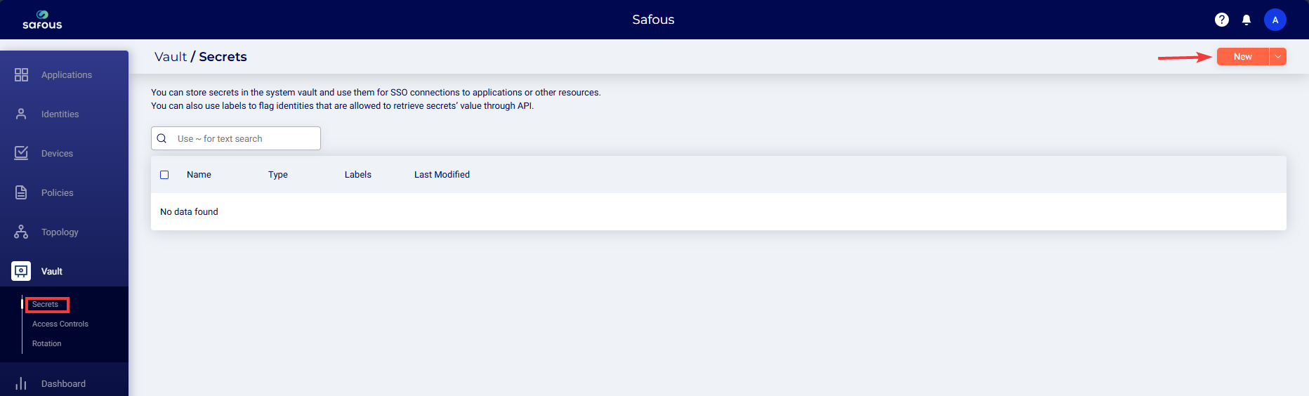 - Navigate to the Vaults > Secrets page and click New.