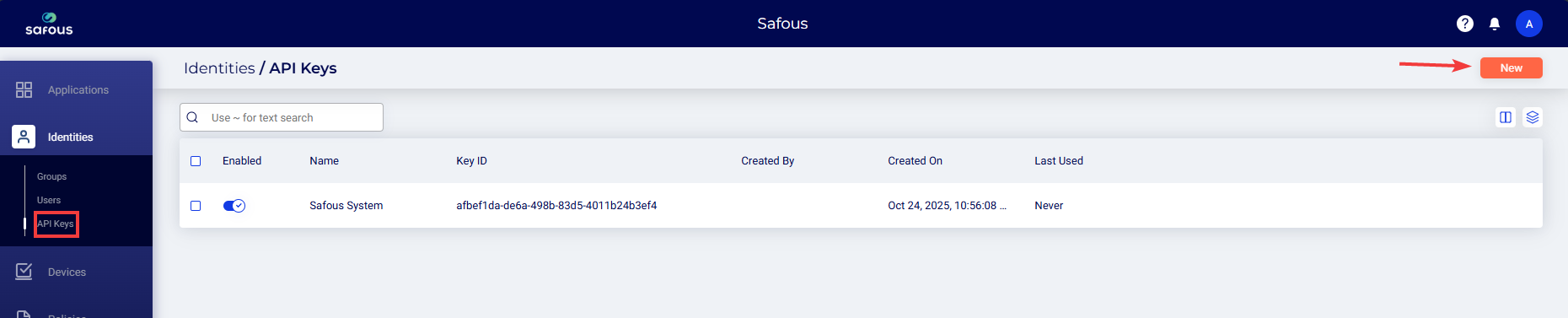 - Navigate to the Identities > API Keys page and click New.