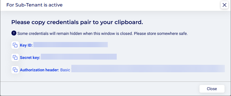 - Copy the Key-ID, Secret key, and Authorization header and store them. The keys will not be visible once this window is closed.