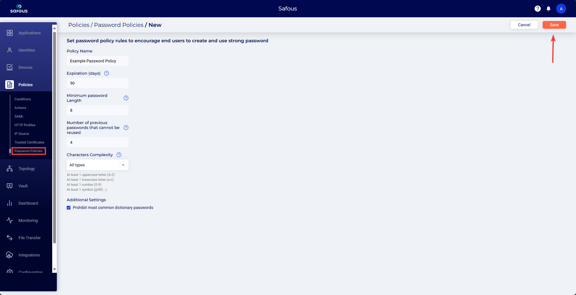 Password policies set the baseline standards for user passwords to enhance login security. This article will guide you through the process of creating a password policy in the Safous Application Portal and applying it to a local identity provider profile.