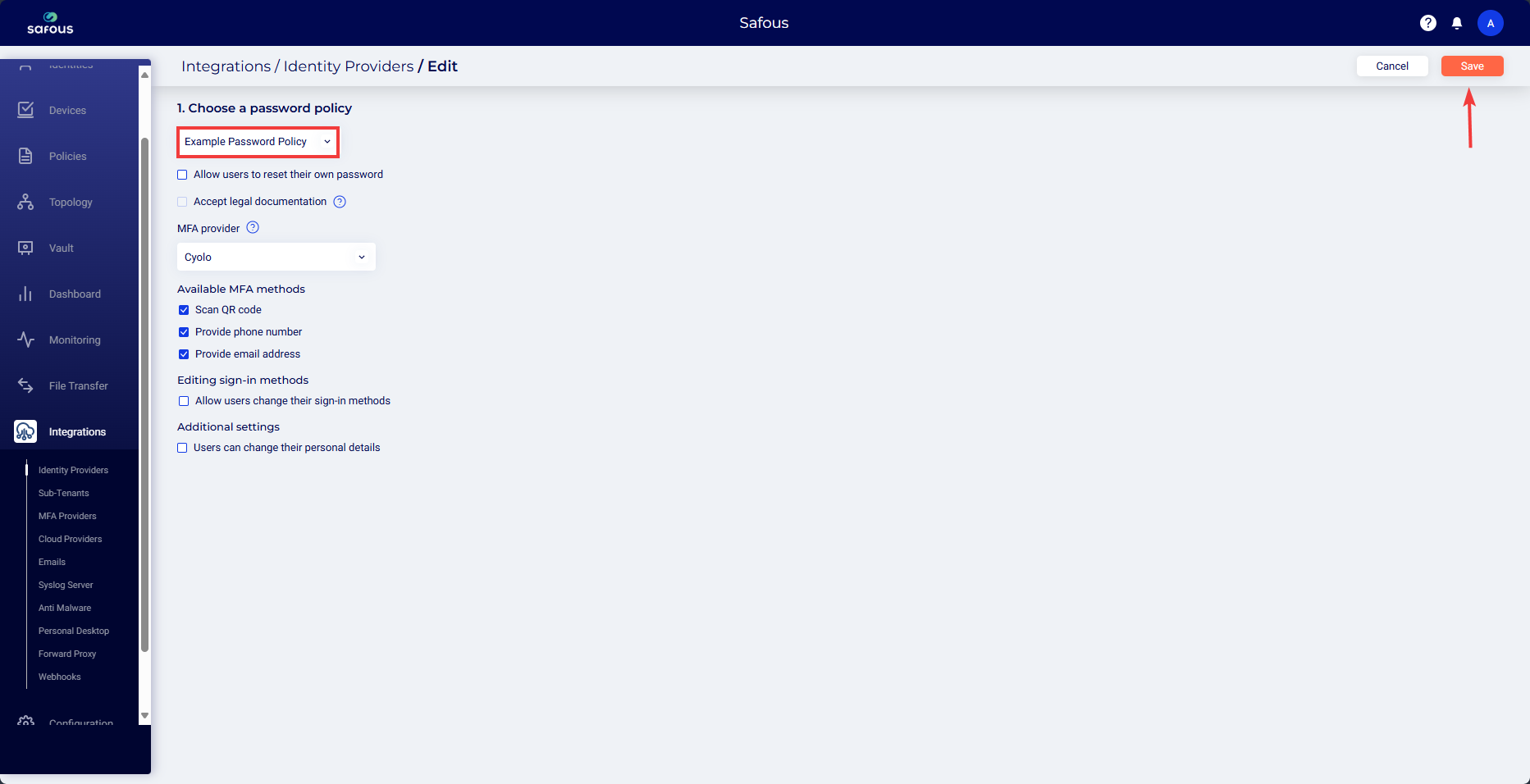 MFA provider: Click the drop-down menu to select the MFA provider. By default, Safous is selected. For an external MFA provider to be listed here, the external provider must have been created on the Integrations > MFA Providers page. Selecting None would not prompt the user for MFA. However, if MFA is enabled on either the Configurations > Global Settings page or in Conditions profiles on the Policies > Conditions page, setting this option to None would effectively block users requiring MFA to access resources.