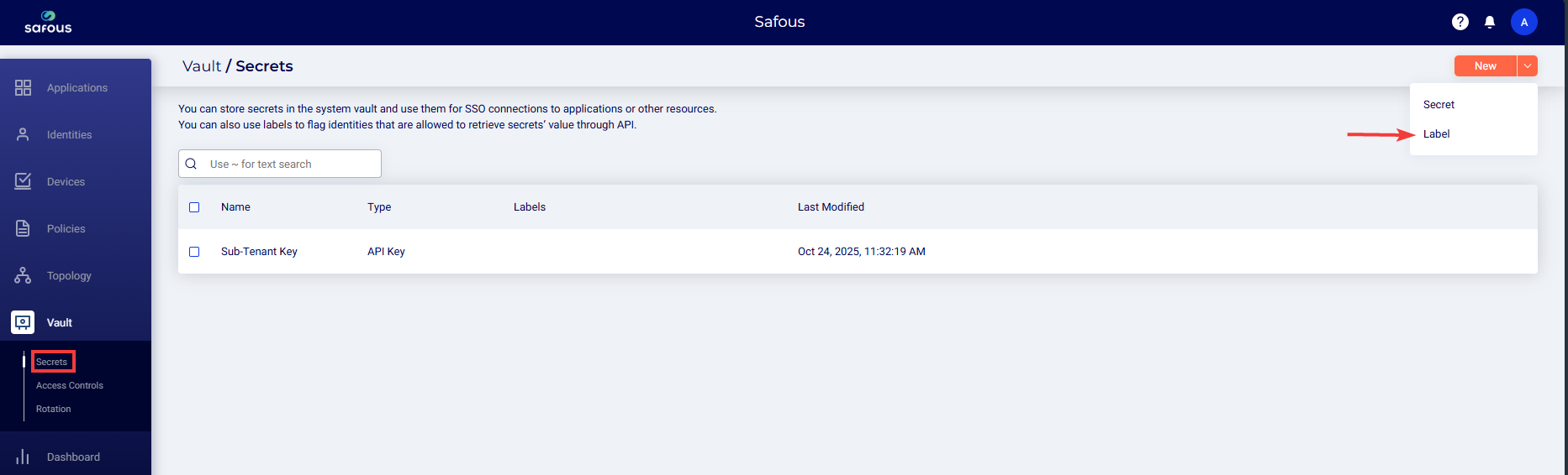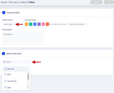 - Go to the Vault > Secrets page. Click the drop-down next to the Add button and select Label.