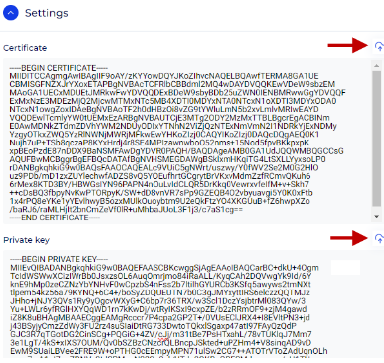- Certificate Data: Click the upload icon and select the certificate file (without the private key), or paste its content here.
