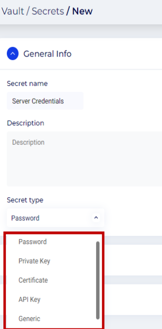 Secret type: From the drop-down menu, select any one of the following type of secrets: