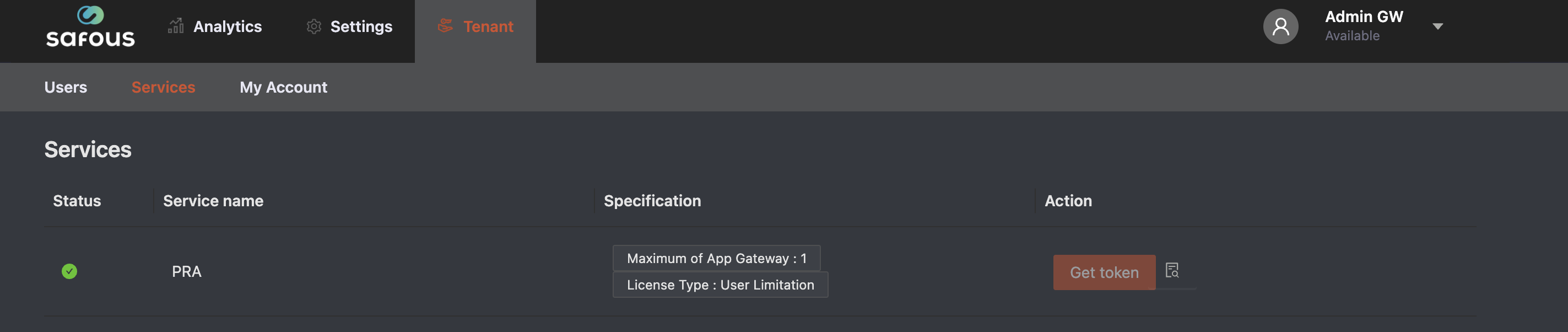 Action, this column shows what kind of action available for the service. For PRA, you will be able to get installation token when clicking the Get token button as long as the quota for App Gateways is still available (depends on the permission).