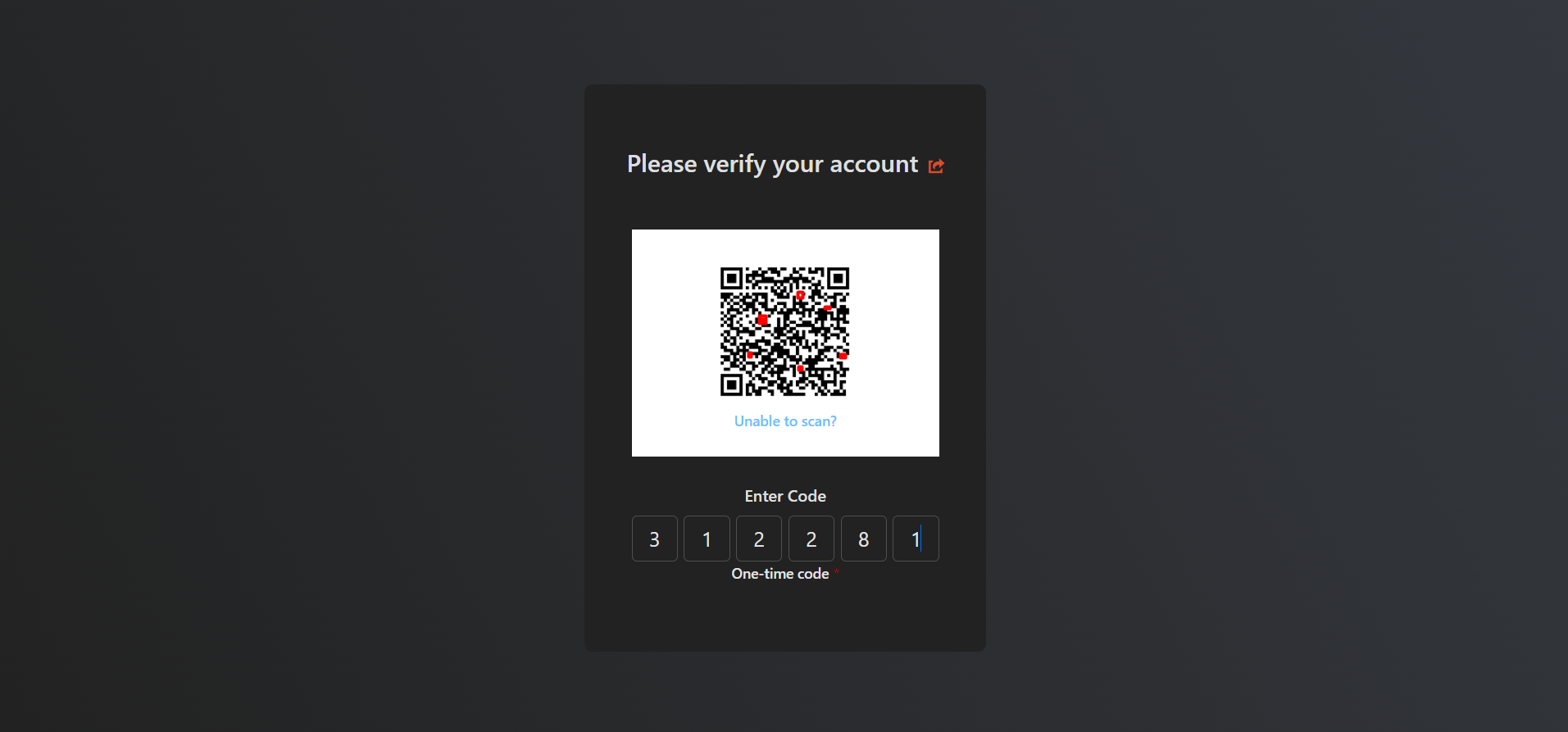 If the username and credentials you entered are correct, you will be redirected to a verification page to enroll in multi-factor authentication (MFA). Scan the QR code using your favorite authenticator application, which will provide you with a time-based token to be entered.