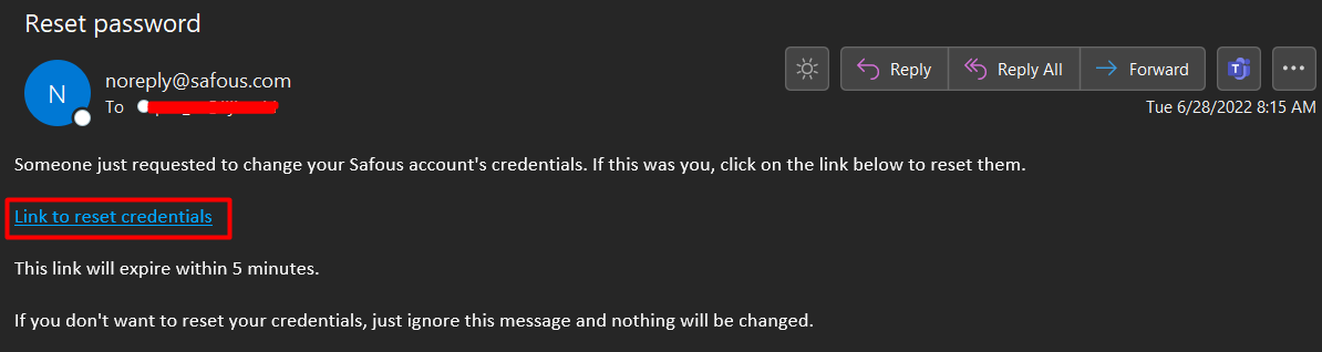 Check your email inbox for a password reset notification from Safous