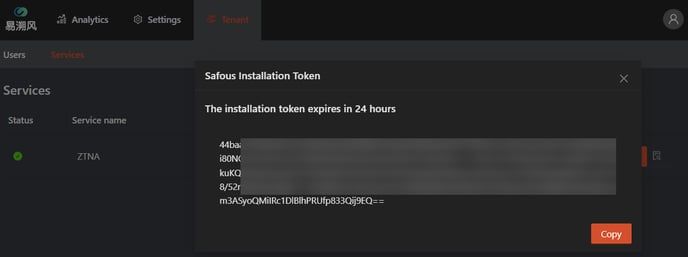 Once you have clicked the Get Token button, Safous will generate Safous Installation Token needed for the installation of App Gateway and display it on the browser tab.