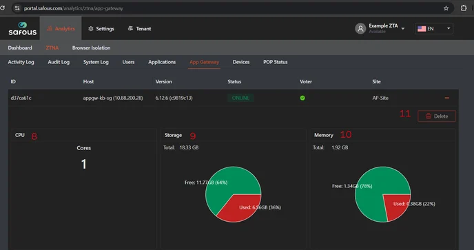 Storage: Storage information of the server hosting the App Gateway