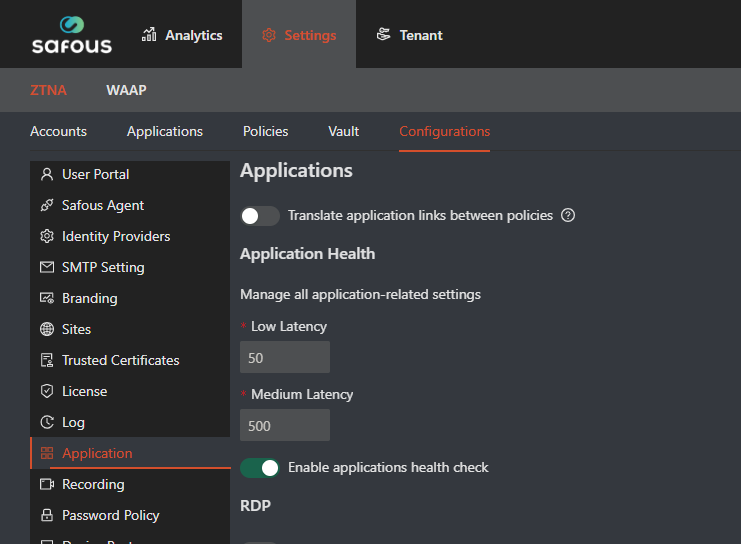 Applications health checks are enabled by default in the Admin Portal under Settings > ZTNA > Configuration > Applications.Â