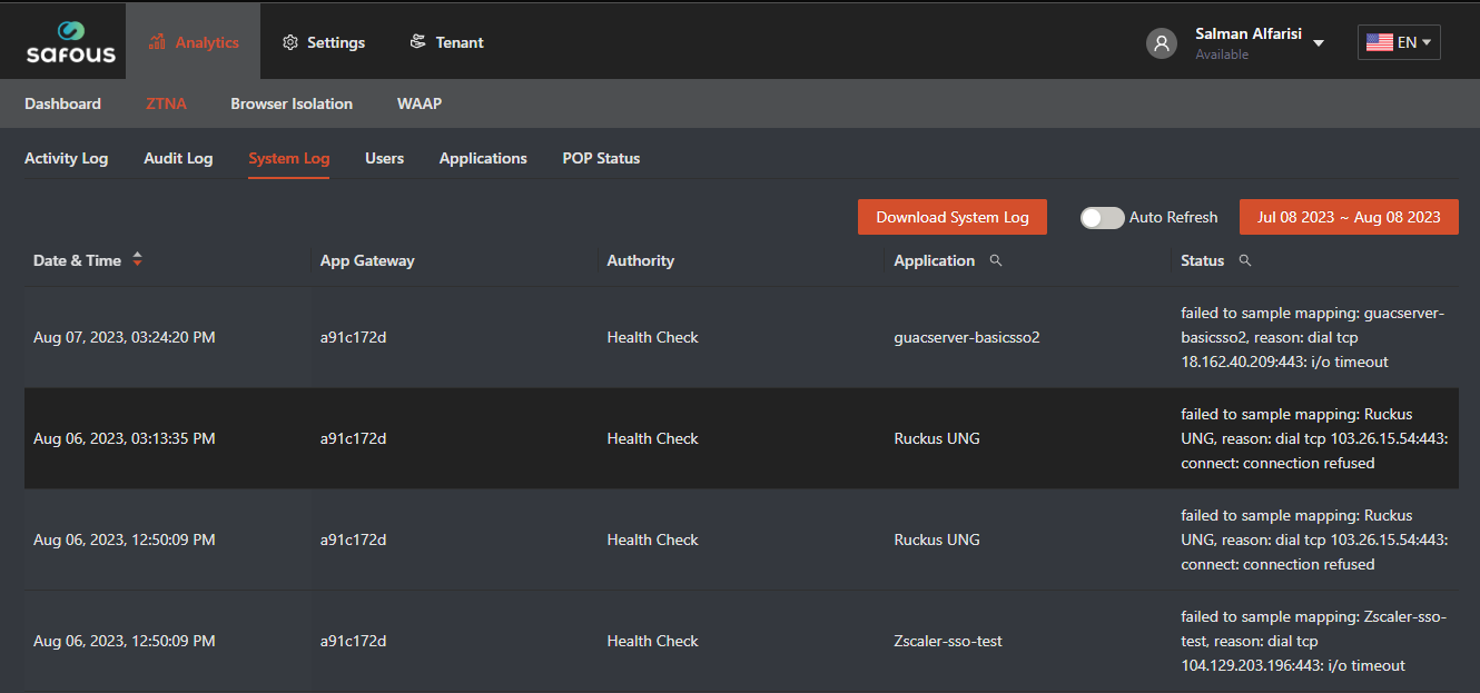 If Safous fails to sample an application, it logs this failure into the Admin Portal's Log screen, under Analytics > ZTNA > System Logs. These error messages will include:Â