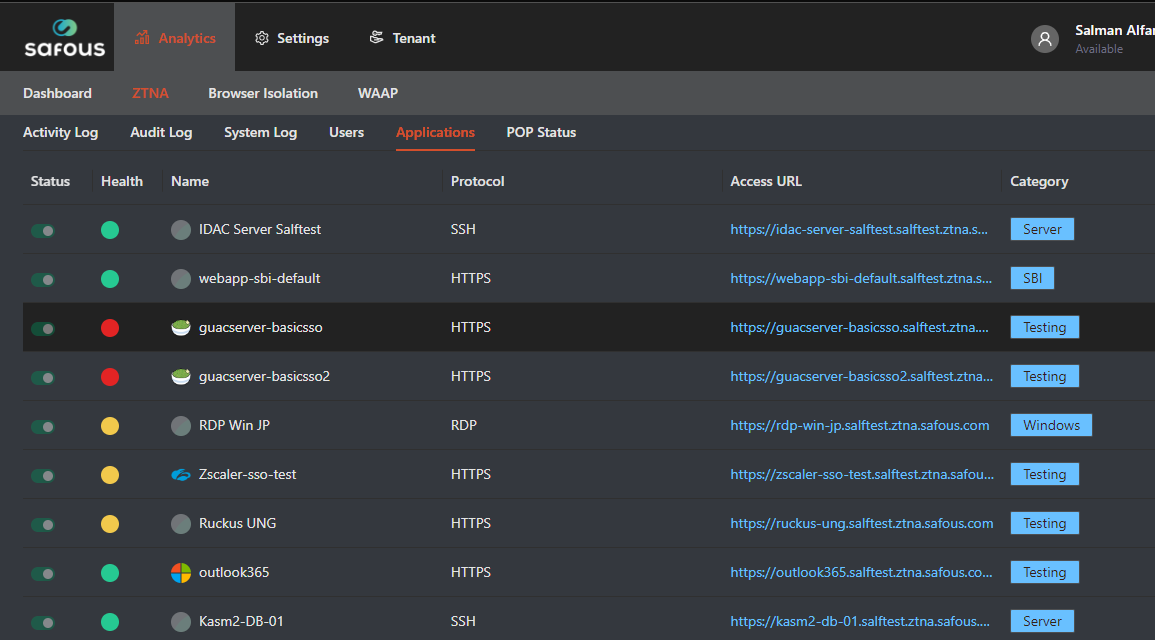 The health of the application can be checked under Analytics > ZTNA > Applications