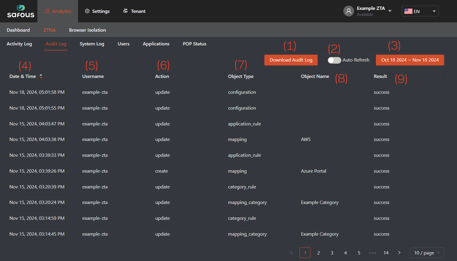- Download Audit Log: Option to download audit logs in CSV or JSON format.