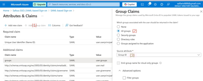 Here you add a group claim. In the advanced options, enter a claim name that you will also configure in Safous: