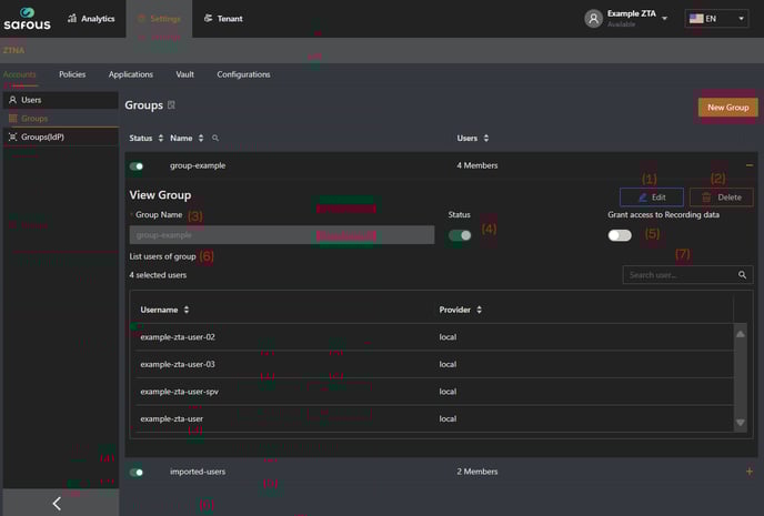 You can configure and set up several things that are related to your environment's groups management. This groups management can be accessed by navigating to Settings > ZTA > Accounts > Groups. Below is the example screenshot for the groups management that you could find in Admin Portal.