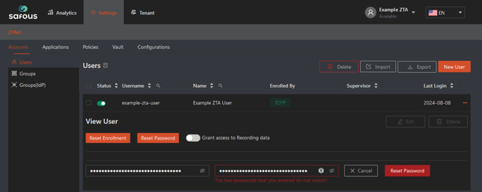 - When the "Reset Password" button is clicked, it will ask for the new password and the password verification for the new password. If the password doesn't match it will show the warning message