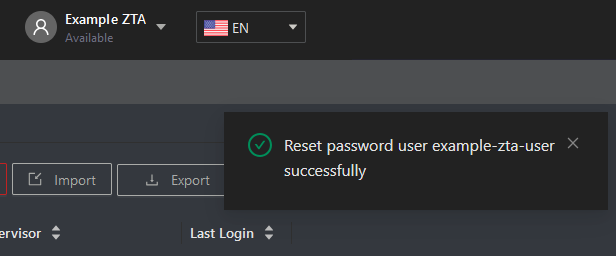 - The system will process the reset password request and when finished, a pop-up notification will show indicating the password has been successfully reset.