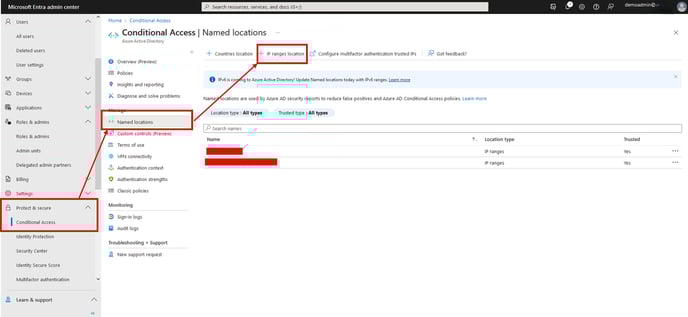 Navigate to Protect and Secure > Conditional Access > Named locations > and select add IP Ranges location