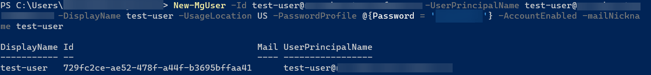 New-MgUser -Id test-user@domain -UserPrincipalName test-user@domain -DisplayName test-user -UsageLocation US -PasswordProfile @{Password = 'password'} -AccountEnabled -mailNickname test-userBelow is the result of the command above: