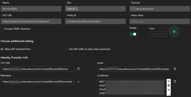 $issueruri = "https://<Your Safous Tenant>.ztna.safous.com/v1/saml/<Your Microsoft SaaS name>/metadata"