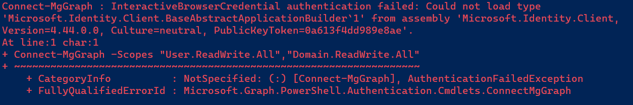Run this command in the PowerShell:Install-Module -Name Microsoft.Identity.Client -RequiredVersion 4.44.0.0After the installation succeed, close the PowerShell Window. Then reopen the PowerShell with admin access and run the