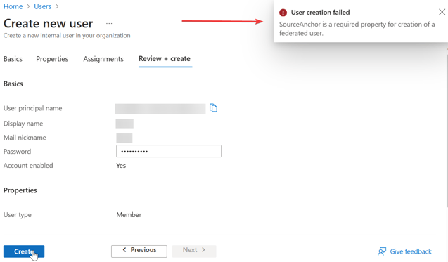 If you try to create the Microsoft user anywhere not from the PowerShell command (e.g. Microsoft admin, Microsoft Entra Id), you would get an error message like this:
