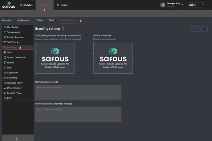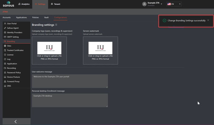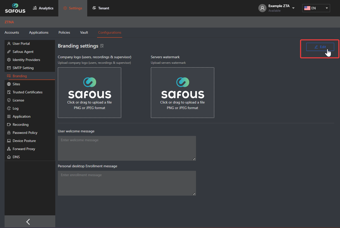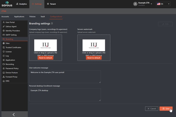 - Navigate to SettingsΒ tab > ZTNA > Configurations > Branding