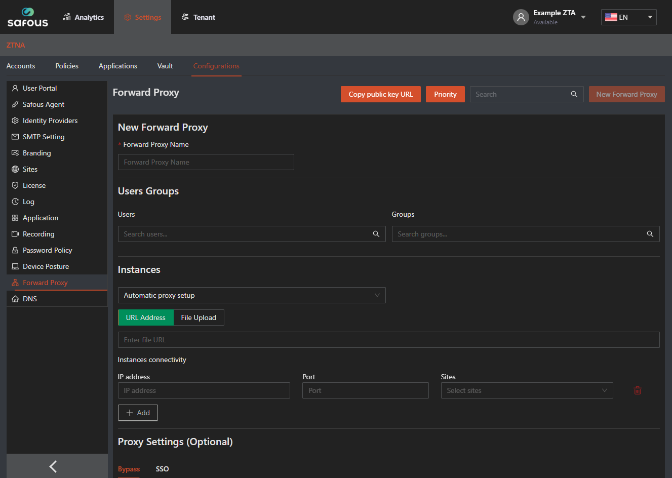 In the Admin Portal, navigate to the Settings > ZTNA > Configurations > Forward Proxy. To add a new Forward Proxy, click on the orange New Forward Proxy button in the top right-hand corner.